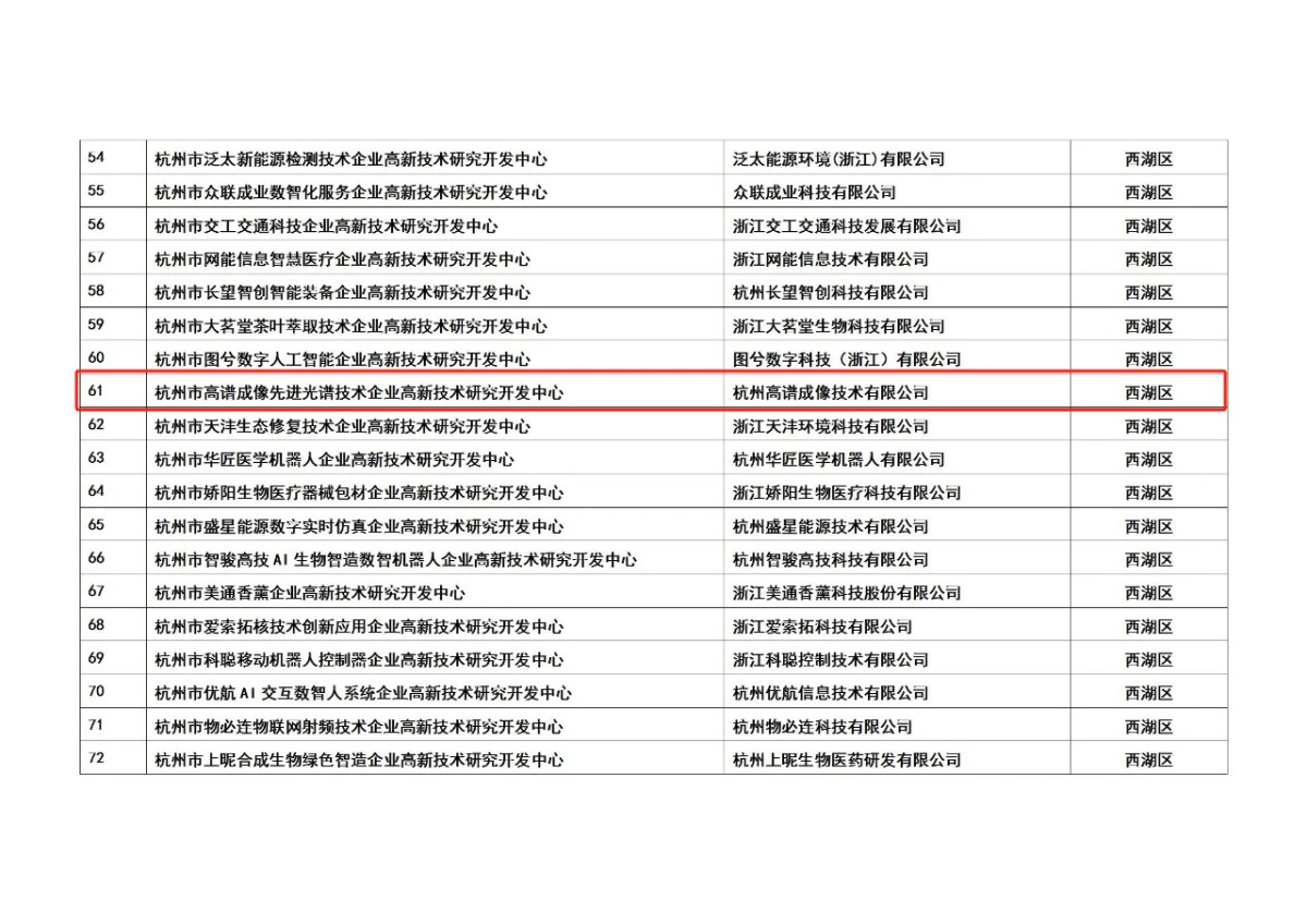 A total of 412 units, including the “Hangzhou Dongchangyuan Future Energy Equipment Enterprise High-Tech R&D Center,” were confirmed to meet the establishment criteria for Hangzhou Municipal Enterprise High-Tech R&D Centers. Among them, Hangzhou Hyperspectral Imaging Technology Co., Ltd. (HHIT) has been officially approved to establish the “Hangzhou HHIT Advanced Spectral Technology Enterprise High-Tech R&D Center.”