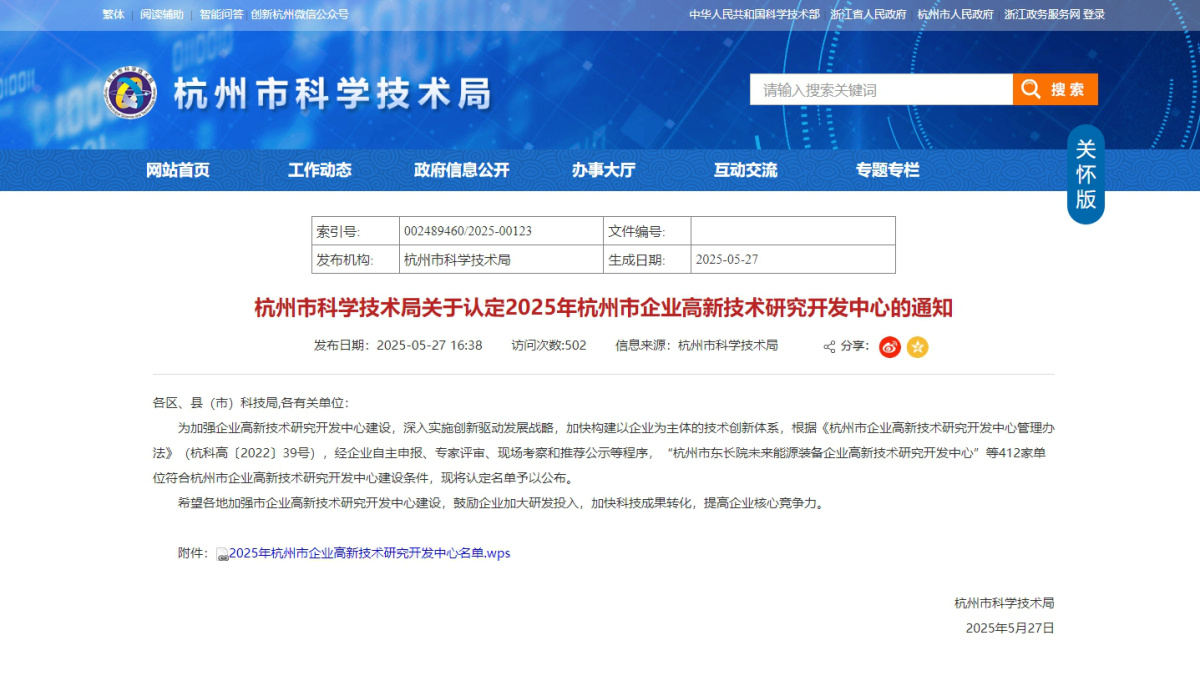On May 27, 2025, the Hangzhou Science and Technology Bureau issued the *Notice on Recognizing the 2025 Hangzhou Municipal Enterprise High-Tech Research and Development Centers*. To strengthen the construction of enterprise high-tech R&D centers, deepen the implementation of the innovation-driven development strategy, and accelerate the establishment of a technology innovation system led by enterprises, the Bureau conducted a rigorous process including independent enterprise applications, expert evaluations, on-site inspections, and public recommendations in accordance with the Hangzhou Municipal Enterprise High-Tech Research and Development Center Management Measures.
