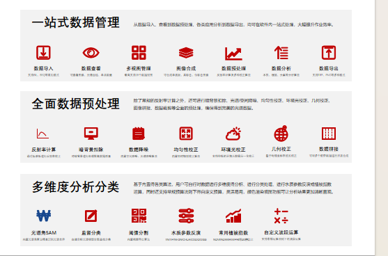 数据预处理 | 数据立方体裁剪拼接、数据翻转与旋转、暗背景扣除、图像去噪、数据校正、数据降维、波段运算、目标监督分类功能 | |