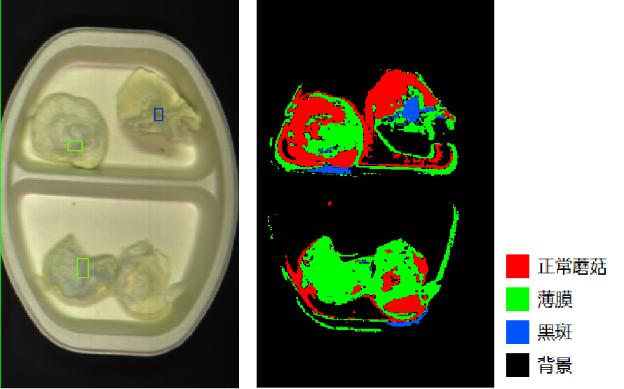 使用深度学习算法建立模型,用颜色渲染工具填图,木质化鸡肉和正常鸡肉具有明显区别,该功能可以规模化应用在的鸡胸肉是否有木质肉的生产检测线上。