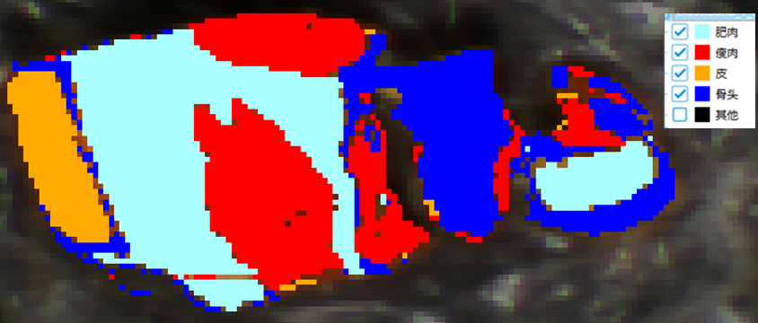 利用高光谱相机对猪肉采集数据,加上专用算法能够识别并直观展示待测肉品中不同成分的含量。